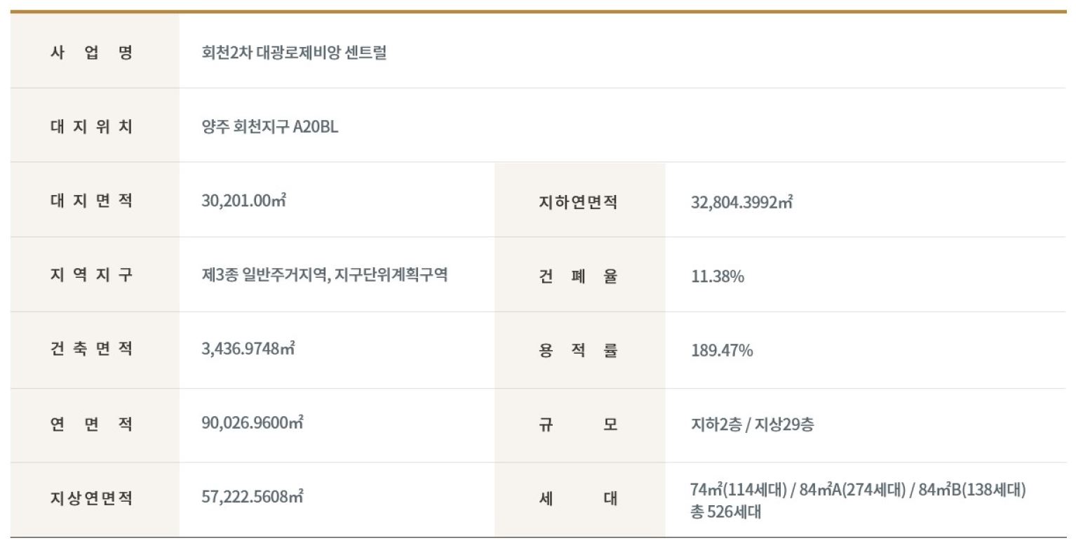 • 공동주택의 명칭은 “양주 회천지구 A-20BL 대광로제비앙 센트럴”으로 잠정 결정하였으며, 본 아파트는 공정률 60% 이후에 분양하는 후분양 아파트로 추후 변경 시 이의를 제기할 수 없습니다.